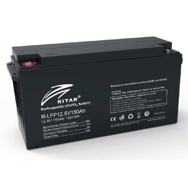 The Ritar 12.8V 150Ah LiFePO4 battery is a high-performance deep cycle lithium battery ideal for solar energy systems, RV power, and marine applications. With a built-in BMS, it provides reliable protection and a long-lasting lifespan of over 3500 cycles. This lithium-ion battery is a lightweight, maintenance-free, and safe replacement for lead-acid batteries, offering superior performance for off-grid and backup power solutions.