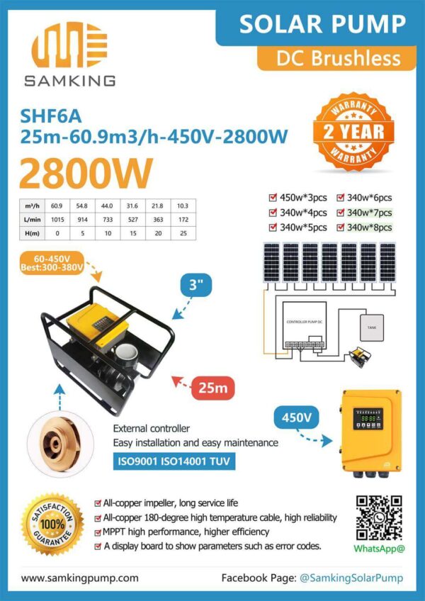 Explore the SumKing SHF6A solar surface pump: 2.8 kW DC centrifugal with 3″ inlet/outlet, UP to 60.9 m³/h flow and 25 m head, built-in MPPT external controller, stainless-steel body—perfect for solar irrigation and off-grid water systems.