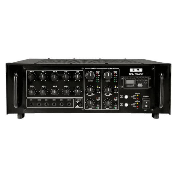 Discover the Ahuja TZA-7000 DP — a robust 700 W two-zone PA mixer amplifier with built-in MP3 playback, USB/SD/MMC support, and seamless 36 V DC backup. Includes multiple mic/aux inputs, dual-zone control and safety features. Ideal for schools, places of worship, and events.
